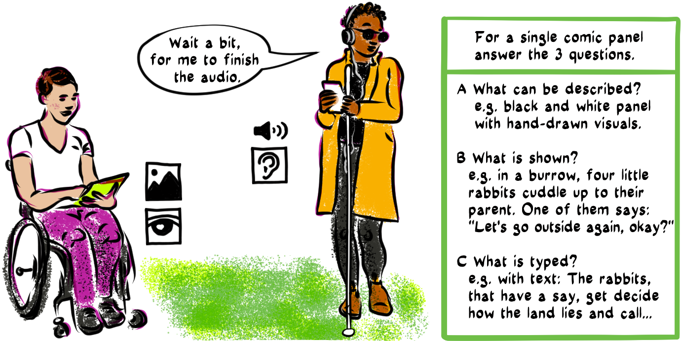 In a green frame instructions to create alternative texts for images: For a single comic panel answer the 3 questions.