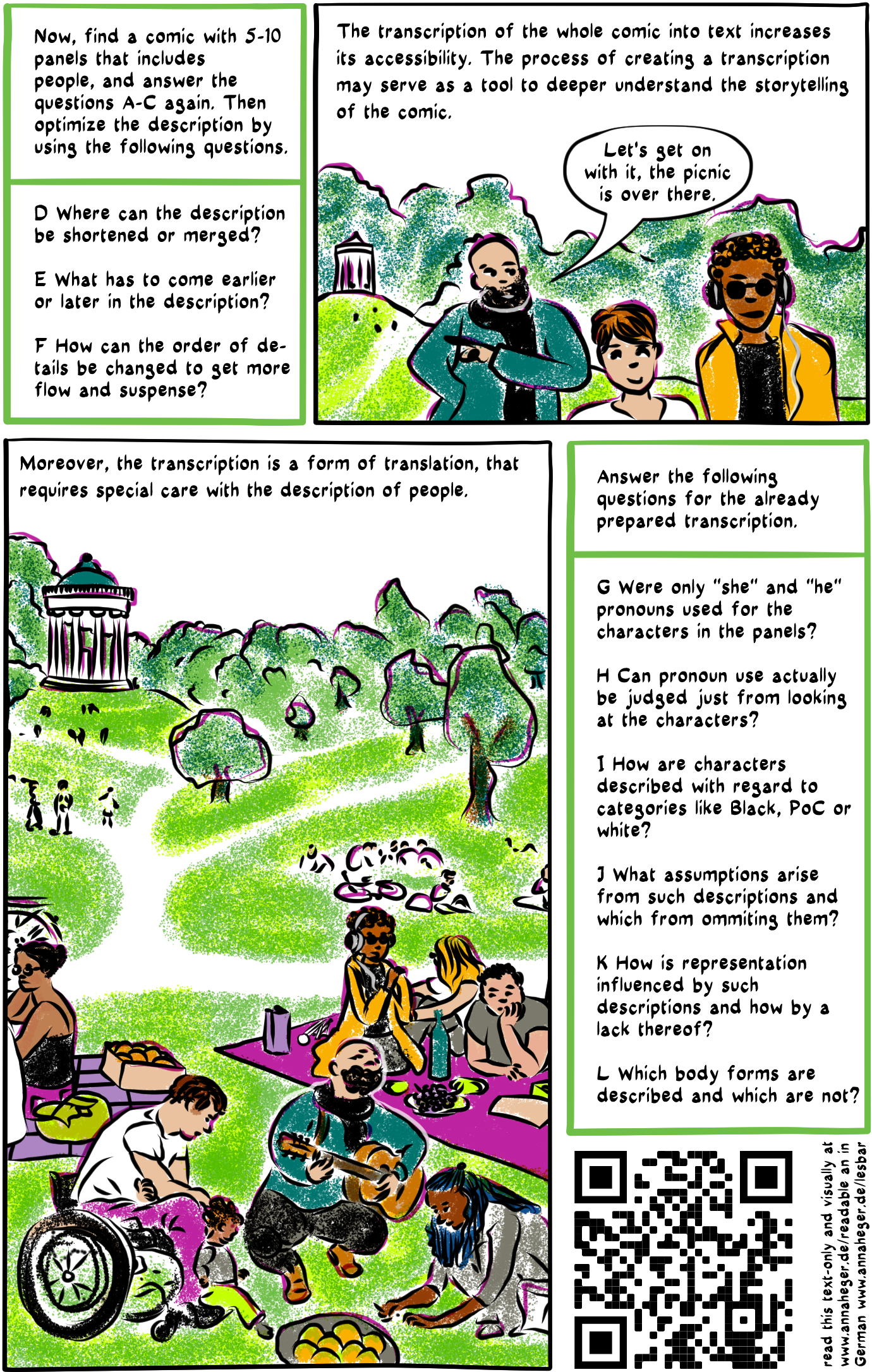 Next to a QR code to the online Version of the comic, the text: text based oder visually readable: dt. www.annaheger.de/lesbar and en. www.annaheger.de/readable